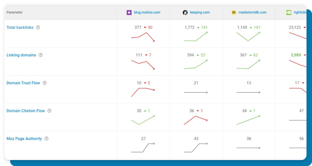 Compare your domain's top metrics against your competition. Get a detailed backlink profile overview including metrics from Majestic and Moz
